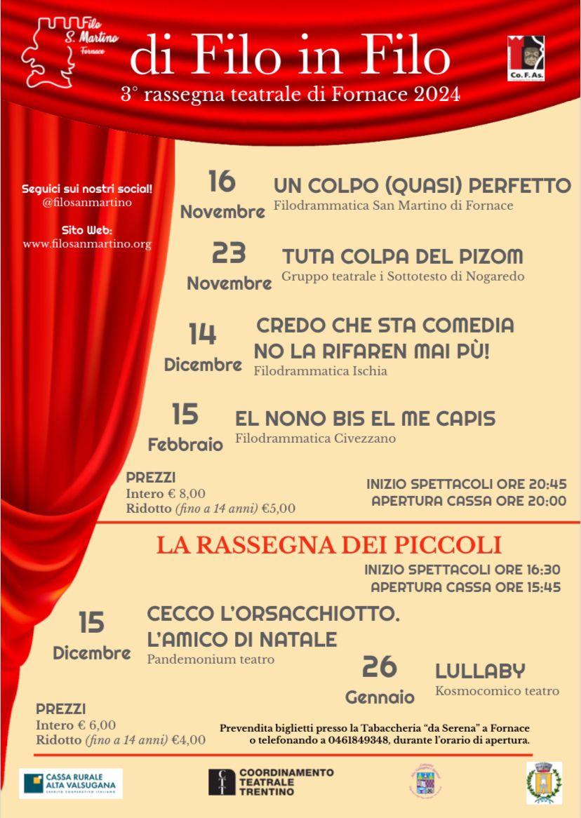 Torna anche quest'anno la rassegna teatrale della Filodrammatica San Martino di Fornace. Oltre agli appuntamenti rivolti ai più grandi ci sarà "La rassegna dei piccoli" che prevede due date dedicate agli spettatori più giovani.